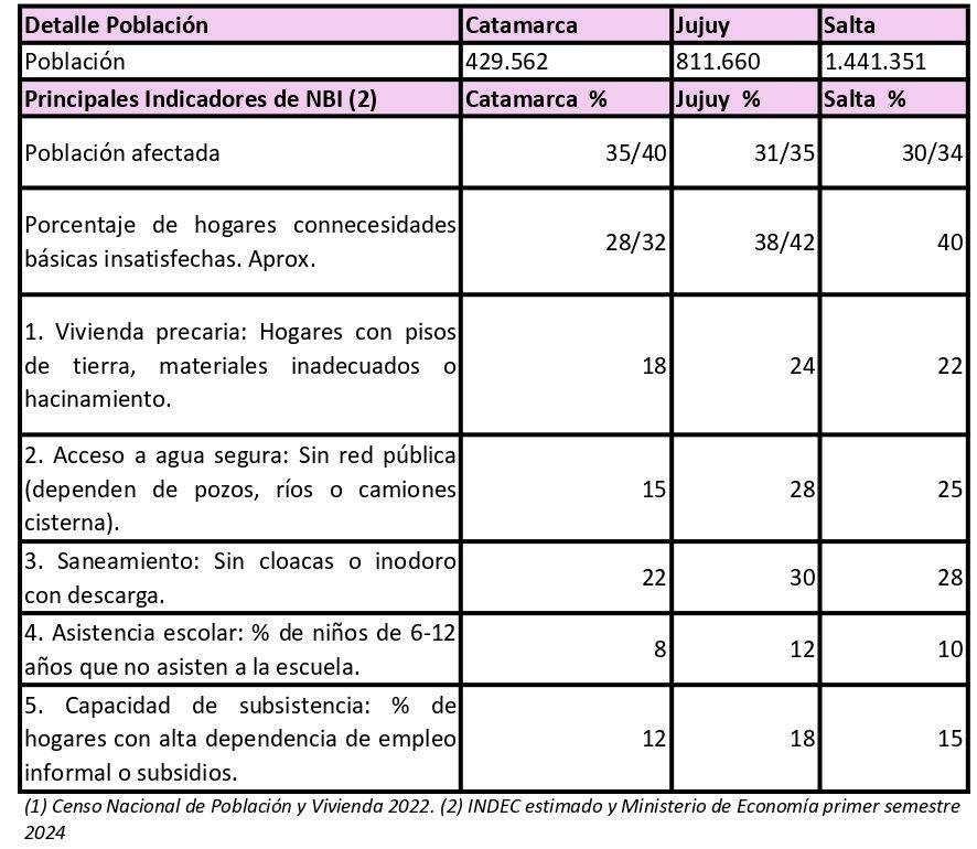 La comparación histórica con datos del Censo Nacional de Población y Vivienda del año 2010 muestra en las tres provincias un incremento sostenido de las necesidades básicas insatisfechas en los hogares (Catamarca, 24.5%; Jujuy, 26,3%, y Salta 25,8%). En este contexto, los departamentos más afectados son algunos donde la minería tiene su asiento más importante (Catamarca: Santa María, 42%; Antofagasta de la Sierra, 38%; Jujuy: Cochinoca, 52%; Santa Catalina, 48%; Rinconada, 45%; Yavi, 42% y Humahuaca, 36%; Salta: Rivadavia, 48%; San Martín, 42%; Orán, 38%; Los Andes, 36%). Lo que nos da una brecha territorial urbana vs. rural muy marcada: Catamarca: S/D; Jujuy 20% vs. 45%; Salta: 18% vs. 45%.