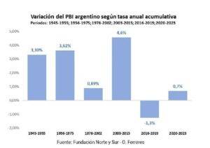 El crecimiento en las tres décadas de la industrialización por sustitución de importaciones (que incluye los periodos muy distintos del primer peronismo y de la pugna hegemónica entre 1955 y 1976) casi cuadruplicó el del cuarto de siglo posterior. Es decir, el de la última dictadura y el menemismo, dos gobiernos endeudadores según el modelo de la valorización financiera. Esto no puede atribuirse a la casualidad, al alto precio de un commodity o a la baja tasa de interés.
