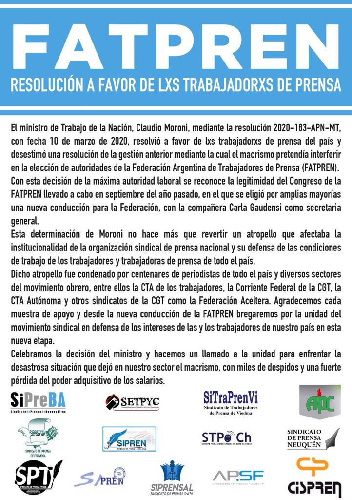 Numerosos reclamos siguen su curso como estigmas de un pasado moroso que cuesta mover con la celeridad de los tiempos urgentes que vivimos, arrancando desde las catacumbas de la secretaría de Trabajo a cargo de Dante Sica. La ratificación de la nueva conducción de la FATPREN, cuya anulación fuera uno de los mayores papelones de la secretaría macrista, puso las cosas en orden. Carla Gaudensi, de SIPREBA, quedó confirmada en la secretaría general.