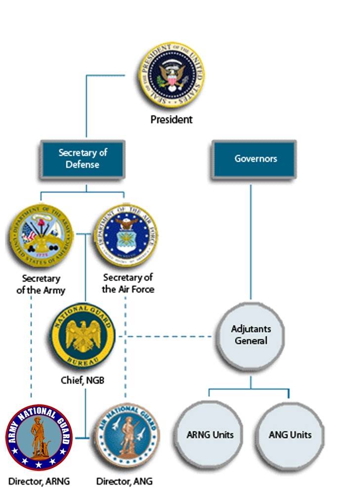 La Guardia Nacional es comandada por el National Guard Bureau (NGB), que se encuentra bajo la órbita del Departamento de Defensa. El Buró actúa como enlace entre los Estados de la Unión y los secretarios del Ejército y la Fuerza Aérea. El jefe del NGB es un miembro de la Guardia Nacional, fuerza que se encuentra dividida entre la Guardia Nacional del Ejército —primera reserva del Ejército estadounidense— y la Guardia Nacional Aérea —primera reserva de la Fuerza Aérea—. Cada rama de la Guardia Nacional es liderada por un director, que a su turno es elegido por el secretario del Ejército y por el secretario de la Fuerza Aérea, respectivamente. A su vez, la Guardia Nacional depende de los gobernadores cuando no se encuentra bajo servicio federal, por lo que cada mandatario provincial designa a un adjunto general para comandarla en su función local.