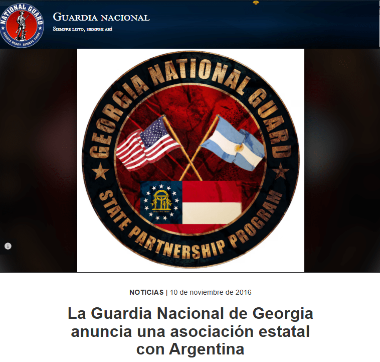 El 10 de noviembre de 2016, el estado de Georgia (Estados Unidos) informó que su Guardia Nacional había sido seleccionada como la operadora del Comando Sur estadounidense para la República Argentina como parte del Programa de Asociación Estatal (SPP) del Departamento de Defensa. En su comunicado, se señalaba que la relación argentino-estadounidense había tomado un notable impulso desde la llegada de Mauricio Macri a la presidencia, y que el mandatario había solicitado tempranamente en 2016 la inclusión de su país en el SPP.