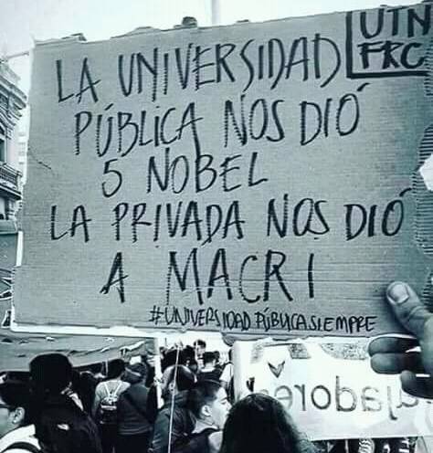 Las agrupaciones prefirieron comunicar desde la imagen. Tal el caso de la bandera con las fotos de los cinco Nóbel argentinos (récord latinoamericano) desde 1936. El más reciente, César Milstein (1984), había emigrado del país luego de la represión dictatorial conocida como “La noche de los bastones largos”. Los cinco premiados egresaron de facultades públicas, donde estudia el 80% de los dos millones de universitarios, aun cuando hay más casas de estudios de gestión privada.