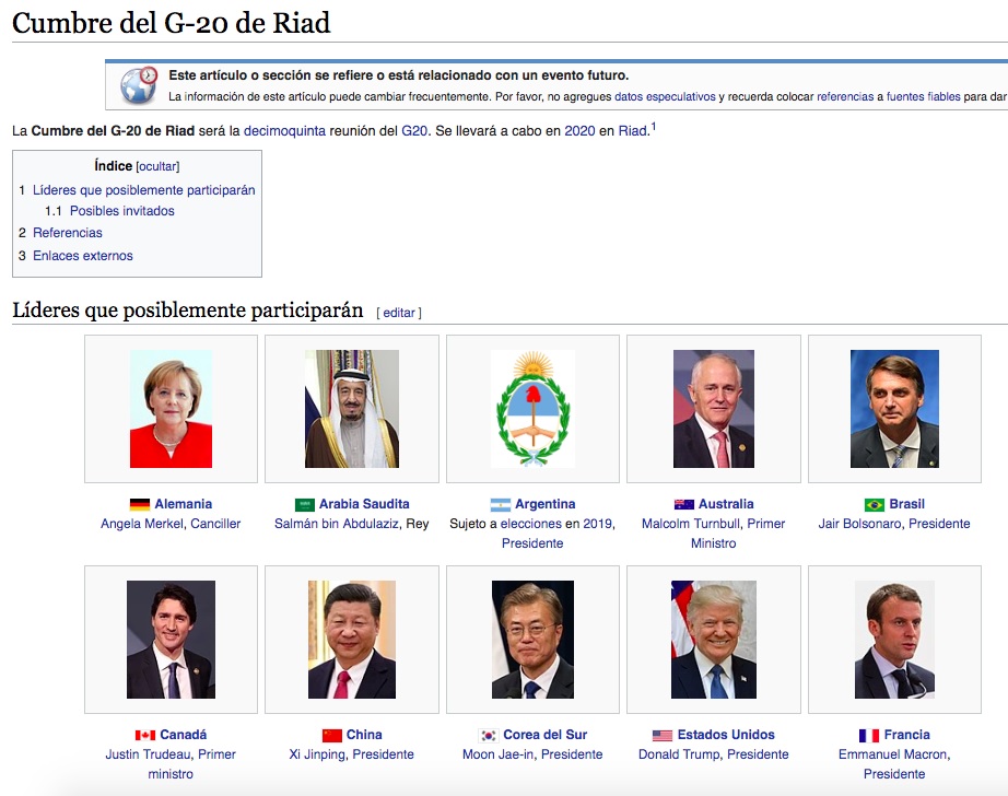 Antes de esas dos faltas, Cristina había participado como jefa de estado o Presidenta electa en todos los cónclaves de los líderes de los países que integran el G20 realizados desde el debut de ese foro mundial en 2008: Washington aquel año inaugural, Londres y Pittsburgh en 2009, Toronto y Seúl en 2010, Cannes en 2011, Los Cabos en 2012 y San Petersburgo en 2013. Angela Merkel, de Alemania, y Recep Erdogan, de Turquía, son los únicos otros dos mandatarios retratados junto a Cristina en todas las fotos de familia que ilustran el final de cada uno de esos encuentros. Los nombres de los demás líderes que posan sonrientes a su lado en aquella primera cita de Washington delatan la longevidad de la ex Presidenta en el escenario internacional: el italiano Berlusconi, el chino Jintao, el francés Sarkozy, el ruso Medvedev, el británico Brown, el mexicano Calderón, el estadounidense Bush. Ninguno permaneció en el poder los seis años adicionales necesarios para fotografiarse con Kicillof en Australia, y sólo Cristina, entre todos esos líderes, otrora rutilantes, conserva viabilidad política, al punto de que ya nadie descarta la posibilidad que ella sea uno de los veinte jefes de estado que viajen a Riad, la capital de Arabia Saudita, para la cumbre de 2020.