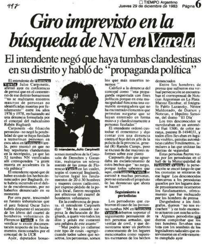 La respuesta de Carpinetti consta en los diarios: no había desaparecidos en el Cementerio y las 52 tumbas de NN correspondían a accidentes de tránsito. Acusó al concejal de encubridor por no haberlo denunciado en su momento (en dictadura). Lo dijo en conferencia de prensa durante el día de los inocentes. Quienes asistieron a esa conferencia, como Néstor Maldonado (DyN) y Julio Sansone (El Día), fueron espiados por tres tipos vestidos de civil que portaban pistolas automáticas 9mm y los siguieron desde el salón de la Municipalidad por todo el trayecto que hicieron en el distrito.