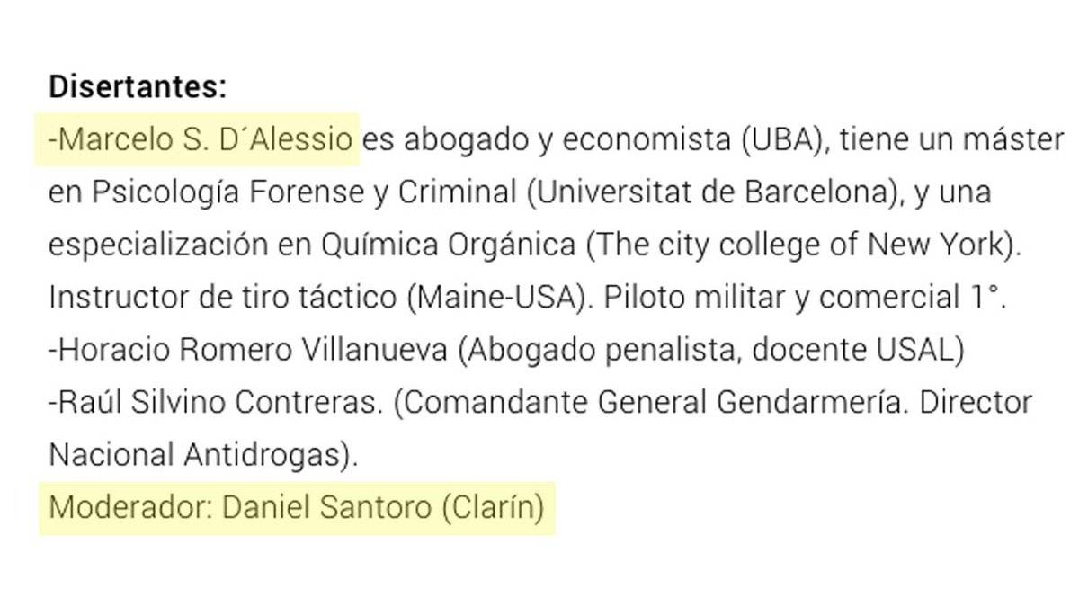 El 27 de noviembre del 2018, la Universidad del Salvador (USAL) y el Foro de Periodismo Argentino (FOPEA) organizaron un sesudo seminario sobre las “Tendencias del narcotráfico en Argentina”. El moderador fue Daniel Santoro, presentado como periodista de Clarín, mientras que Marcelo D’Alessio ofició de invitado estrella. El currículum, difundido por los organizadores, informaba: