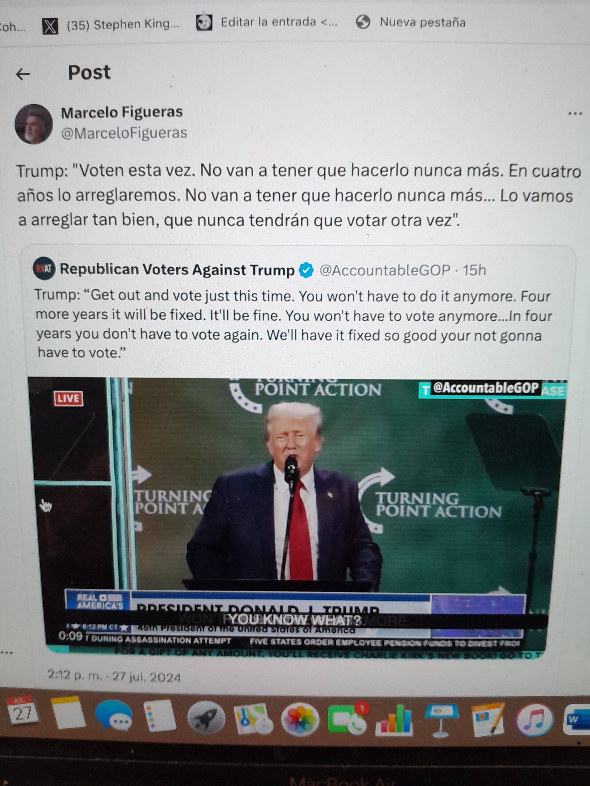 Pero claro: una vez que das por bueno el hecho de que, para ser exitoso en términos capitalistas, necesitás apoderarte de cosas ajenas —porque nadie se hace millonario a consecuencia de lo que produce personalmente, como mínimo explotan a quienes trabajan a sus órdenes—, todo recurso que ayude a que te enriquezcas pasa a ser lícito en sí mismo. El fin de acumular fortuna se vuelve tan central a la religión del dinero del cual deriva el poder, que pasa a justificar los medios empleados para obtenerla. Todo lo que uno haga para llegar a esas alturas queda validado: evadir impuestos, corromper instituciones y a sus autoridades, abusar de su poder para aumentar sus ganancias de forma artificial y adueñarse de porciones cada vez más grandes del mercado. Y una vez que aprendiste a sacarle jugo al instinto asesino primordial del que Kurtz habla —cuando ya te convertiste en un killer en términos económicos, un ejecutor a sangre fría capaz de hacer todo lo que haya que hacer para ganar un dólar más, sin remordimiento alguno—, la distancia que separa al asesinato económico del crimen real (y a la democracia del autoritarismo, como aclaró el Trump que acaba de decir que cuando vuelva a ser Presidente se acabarán las elecciones) se vuelve mínima, por no decir inexistente.