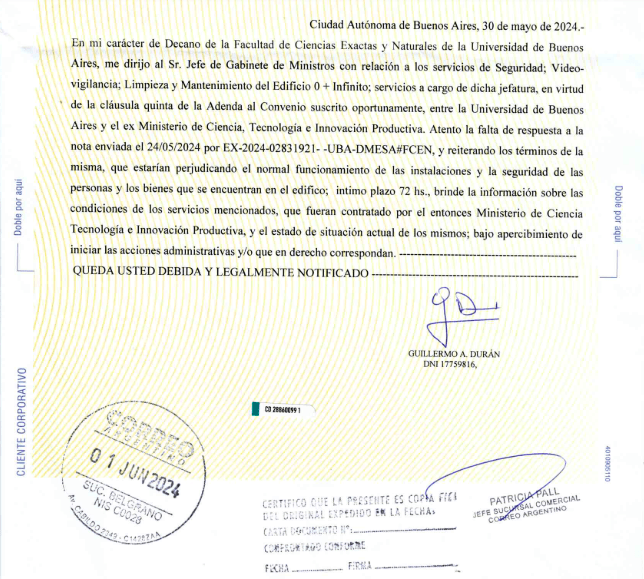 Al cierre de esta nota, en el atardecer del viernes 7, la carta documento remitida a Guillermo Francos el penúltimo día de mayo no había sido respondida, pese a que establecía un plazo de 72 horas. Francos imitó así el desaire de su antecesor, Nicolás Posse, a quien la unidad académica solicitó informes antes de que se produjera su eyección del cargo en medio de la constante interna libertaria. Tampoco obtuvo respuesta de Alejandro Cosentino, el secretario de Innovación, Ciencia y Tecnología, cuya renuncia de la última semana fue una consecuencia de la salida de Posse.