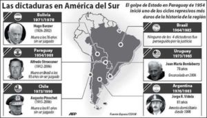 Las dictaduras ya estaban bien instaladas en Brasil y Paraguay cuando, en 1971, el general Banzer derrocó en Bolivia al militar nacionalista y revolucionario Juan José Torres, quien se refugiaría en Argentina y sería asesinado en 1976. En 1972 fue el turno de Ecuador: un golpe militar acabó con la presidencia de José María Velasco Ibarra, otro asiduo exiliado en la Argentina, de donde era oriunda su esposa. En 1973 se instalaron las dictaduras en Uruguay y en Chile con las traiciones de Juan María Bordaberry y de Augusto Pinochet. 1975 fue el turno del Perú, cuando otro nacionalista revolucionario, Juan Velasco Alvarado, fue reemplazado violentamente por la derecha militar. Y en 1976, en el final de ese lustro sangriento, el golpe se consumó en Argentina.