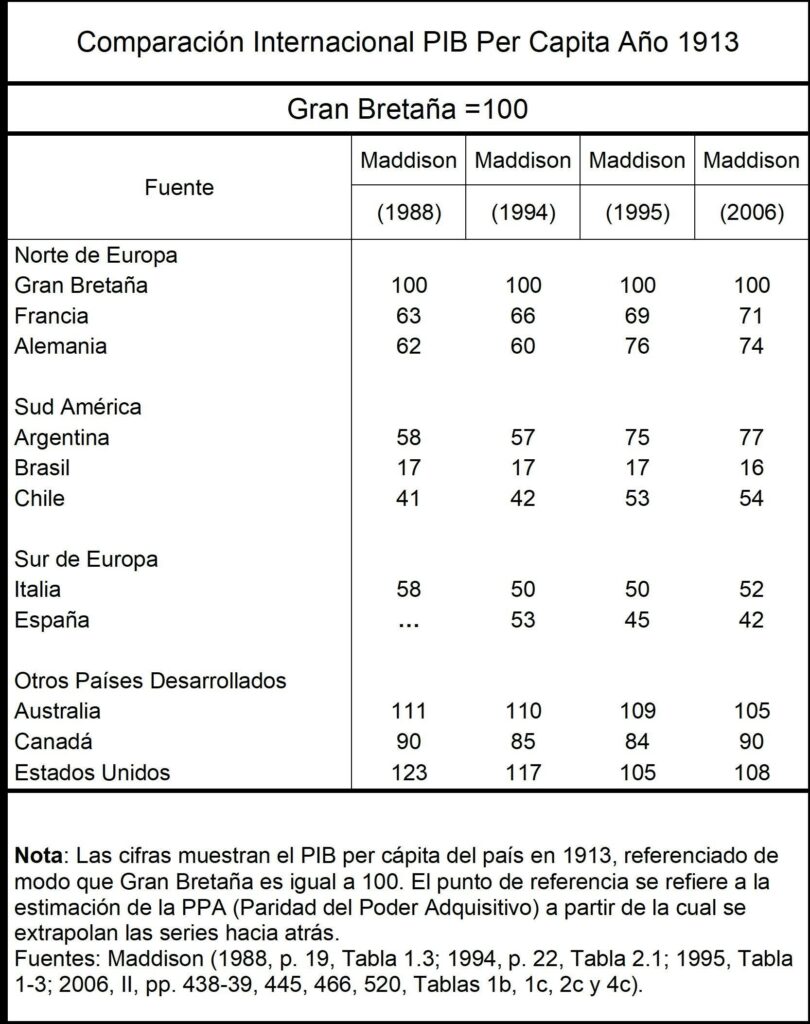 En la nota del blog reafirma que los relatos sobre la historia económica argentina no lo convencen. Centra su argumentación en los problemas que presenta el proyecto del extinto historiador Angus Maddison de producir estimaciones del PIB desde el año cero de la era cristiana. La tabla deja bien clara la cuestión. Francis puntualiza que “la comparación más llamativa proviene de la primera y última versión de su base de datos. En 1988, Maddison calculó que el PIB per cápita de la Argentina en 1913 era el 58% del nivel de Gran Bretaña (…) En 2006, sin embargo, Maddison había decidido que la Argentina estaba muy por delante de estos países en 1913: su PIB per cápita era el 77 % de Gran Bretaña, 25% por delante de Italia y también a la cabeza de Francia y Alemania (…) Esta dramática transformación en la suerte de la Argentina de Maddison (1988) a Maddison (2006) parece haberse debido a la incorporación del sector informal al año base 1990. Maddison (1995, p. 143) escribió: ‘Un problema importante con las cuentas nacionales de las economías latinoamericanas es la evaluación de la actividad en el sector informal. Las revisiones oficiales recientes para la Argentina han sido muy sustanciales. En lugar de un PIB de 2.830 millones de australes en 1980, ahora se estima en 3.840 millones (casi un 36% más)’”.