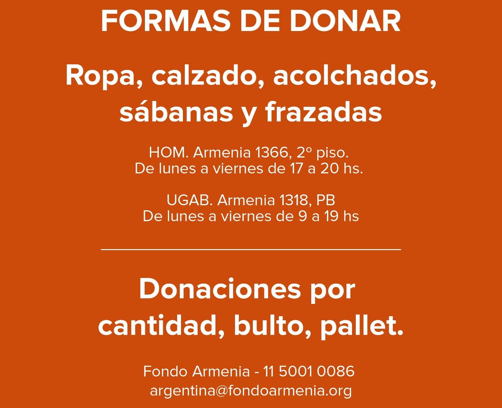 La Comisión de Cascos Blancos del Ministerio de Relaciones Exteriores organiza lo relativo al vuelo Buenos Aires-Yerevan con ayuda humanitaria en un avión ofrecido por la fundación Solidaire.ong. Recomiendan acercar las donaciones pronto, ya que el vuelo saldrá el domingo 22 (ver detalles al final de la nota).