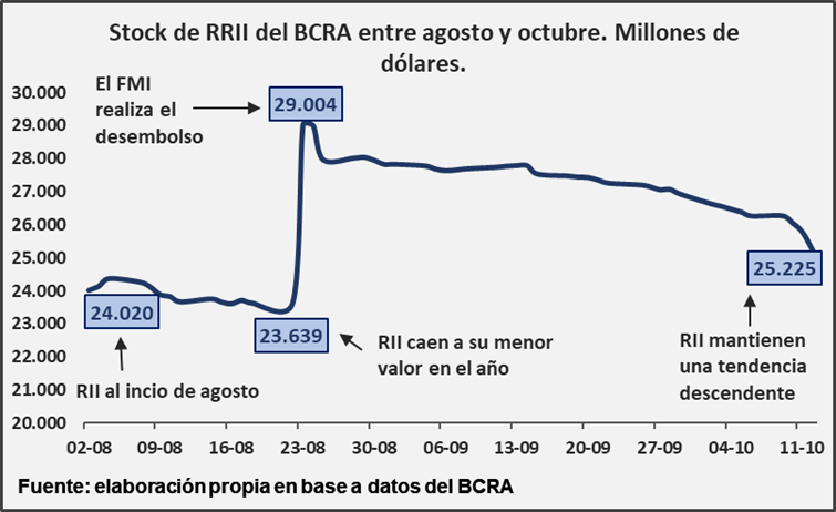 Sus principales acciones consistieron en las quitas de impuestos anunciadas a lo largo de agosto y septiembre para morigerar los efectos de la devaluación dual de julio y agosto. Los 5.300 millones de dólares que se recibieron luego del desembolso del FMI —originalmente de 7.500, de los cuales 2.200 se utilizaron para cancelar un vencimiento— están mermando, y las Reservas Internacionales de las que dispone el BCRA (RRII) están llegando a los niveles que se contabilizaban a mediados de agosto, los que ya eran críticamente bajos.