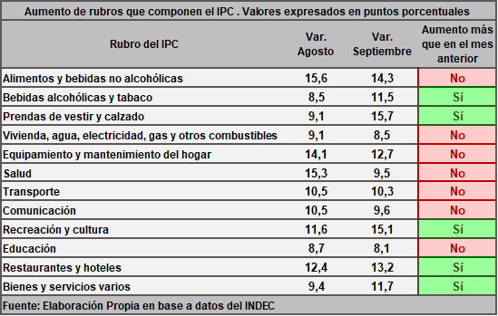 La categoría de bienes que sí mostró una desaceleración es alimentos y bebidas no alcohólicas. En agosto, el incremento había sido del 15,6 %. En septiembre fue del 14,3 %. La superaron prendas de vestir y calzado (15,7 %), y recreación y cultura (15,1 %). Salud, que en el mes pasado tuvo el segundo mayor aumento (15,3 %), en este mes tuvo una variación del 9,5 %. En conjunto, las categorías que mostraron una aceleración en septiembre son cinco, mientras que las siete restantes tuvieron incrementos menores a los de agosto.