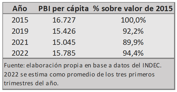 Esto significa que los trabajadores reciben una porción menor de un producto por habitante más chico, lo que se constató las reiteradas veces que se señaló que, pese a la recuperación observada en 2021 de los salarios en términos reales, los mismos equivalían aproximadamente a un 75% de su poder de compra de 2015.