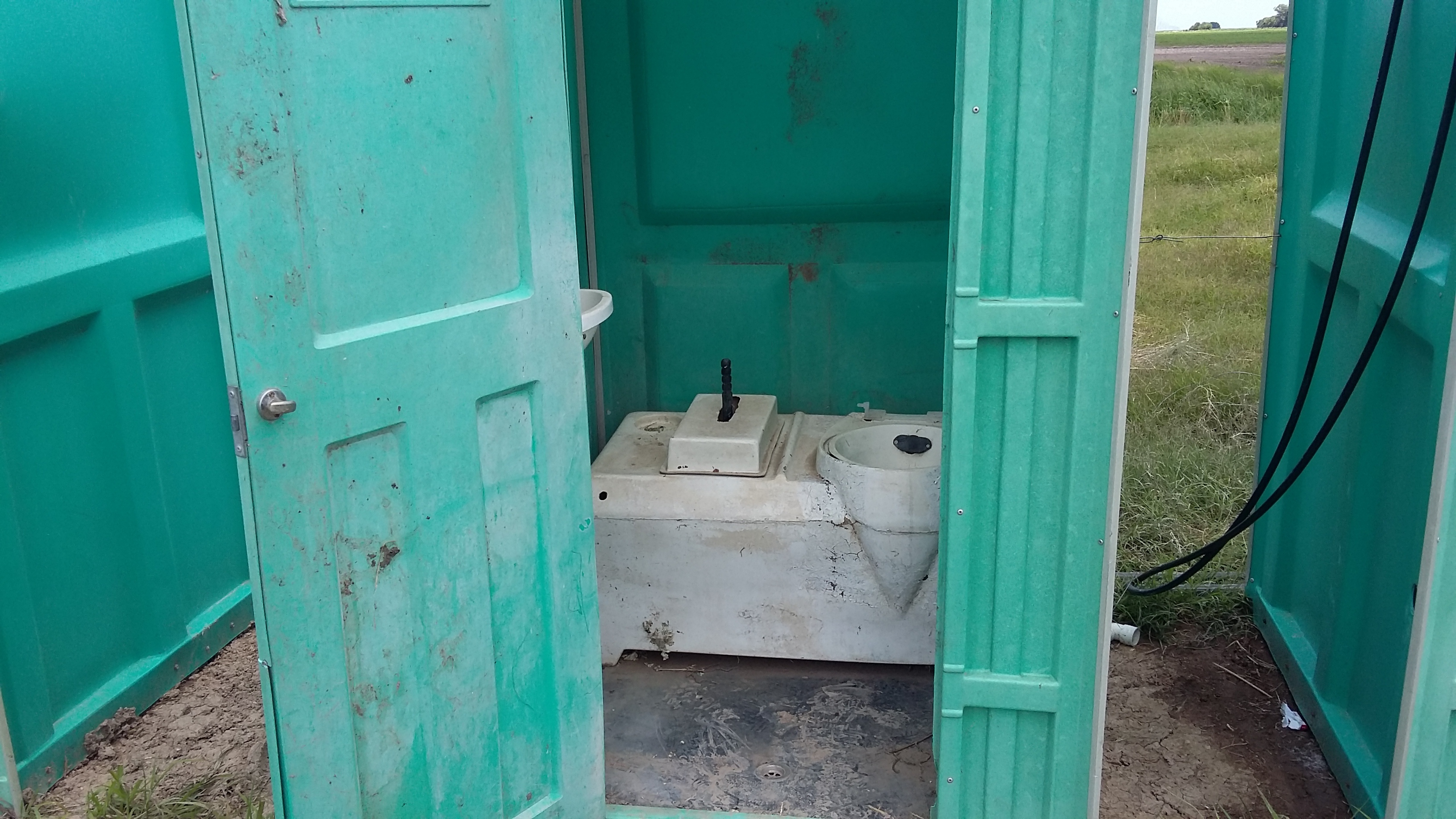 Todavía no sabe si le pagaron o no el bono de fin de año. Escuchó algo pero nadie le informó oficialmente. Tampoco tiene idea de cómo funciona la Obra Social de Guincheros, a cuenta de la cual le descuentan de su salario. Necesita medicamentos por su asma, pero no sabe si esa mutual los cubre. Todavía no llegó la cuadrilla para el desflore del maíz pero vendrá en estos días, asegura Rito. Ellos cobran más pero, por su asma, a Rito le es imposible realizarlo. Los baños químicos que están al menos desde el año pasado en el lugar también sufrieron rotura por la tormenta y el viento. Se observa la falta de mantenimiento y deterioro de los que quedaron sanos.