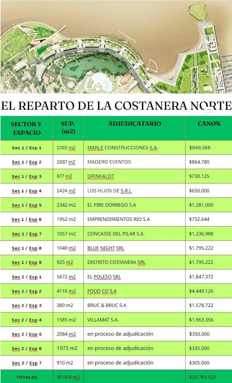Los espacios N.º 8 y 9 del sector N.º 1 fueron adjudicados a Blue Night S. R. L. y a Distrito Costanera S. R. L., empresas que tienen a José Sueiro como accionista, junto al dueño de boliches como Le Brique y Dixit.