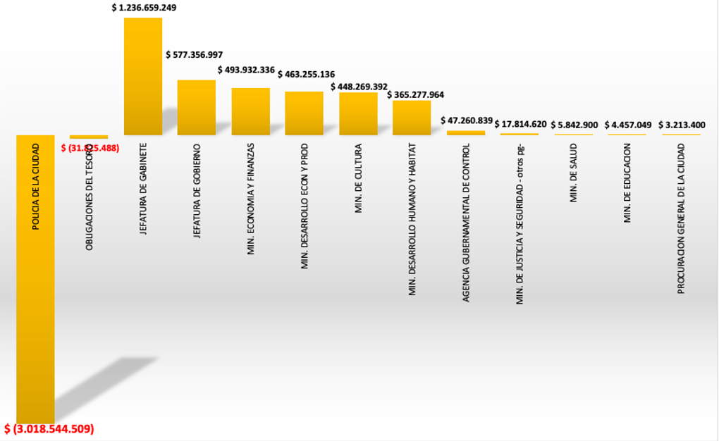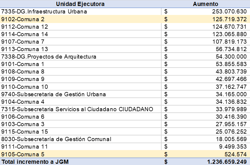 La Jefatura de Gabinete de ministros fue el área más favorecida en la reasignación presupuestaria: recibió más de 1.236 millones de pesos. Como se ve a continuación, el área de infraestructura urbana recibió 253 millones. Pero es notoria la disparidad entre distintos barrios: mientras la Comuna 2 (Recoleta) recibió 125 millones, la Comuna 5 (Almagro y Boedo) recibió apenas 594.000 pesos. Además, 617 de los 843 millones destinados a las comunas se usan para “mantenimiento adicional de espacios verdes”.