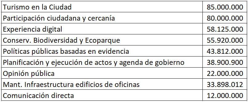 - Subsecretaría de Políticas Públicas Basadas en Evidencia: tiene un programa de “gobernabilidad” que para el proyecto “Ciudad 3D” agrega 43.812.000 de pesos a fin de financiar servicios de consultoría.