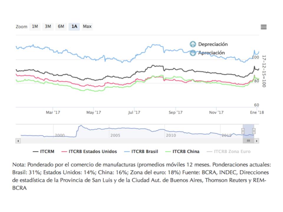 Esta puntuación de riesgo se explica por la convergencia de varios factores, entre ellos el desbalance de cuenta comercial, la sequía de inversiones y el atraso del tipo de cambio real. Mal que le pese a las autoridades del BCRA (que se esfuerzan por mostrar pruebas de que el tipo de cambio real multilateral es competitivo), no deja de estar apreciado si se tiene en cuenta a los otros dos socios comerciales de la Argentina, es decir China y los Estados Unidos, que lucen muy por debajo del promedio, tal como refleja el siguiente gráfico disponible en el sitio oficial del banco.