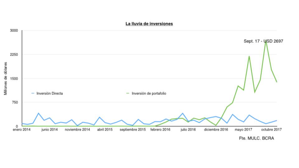 La llamada “lluvia de inversiones” no fue más que un furcio, propio del entusiasmo de un gobierno que llegó al poder ganando elecciones por derecha y que se llena la boca diciendo que viene a modernizar el país, a sacarlo del atraso, a reinsertarlo al mundo; slogans, todos, que ya han sido utilizados por las fuerzas del orden a lo largo de la historia de nuestro país. El siguiente gráfico compara las inversiones directas versus las inversiones de portafolio. Desde el mes de enero de 2016, estas últimas tomaron cada vez mayor preponderancia, acumulando unos U$D 16.500 millones frente a unos escasos U$D 4.817 millones ingresados por inversiones directas, si se toma el período diciembre de 2015 - noviembre 2017.
