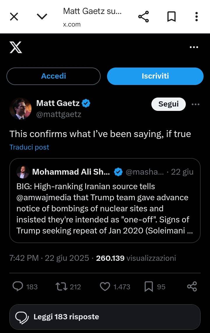 Y evidentemente no lo era, y la tesis de Crooke pareció confirmarse cuando un importante miembro del Maga, apreciado por Trump, Matt Gaetz, sostuvo públicamente que se estaba negociando con Irán una salida (Gaetz había sido propuesto por Trump como procurador general en 2024; el Congreso decidió no apoyarlo). Lo confirmó con un post donde se citaba una importante fuente del gobierno iraní y el mecanismo pactado de un golpe y afuera, en estas páginas, lo llamamos comedia.