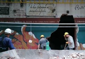 A su lado estaba Charly Pisoni. El militante de H.I.J.O.S. participó en 1997 de la pintura colectiva, hoy convertida en escombros. “Somos una gran cantidad de organizaciones las que vamos a exigirle a Larreta que reponga la pared y los murales. La memoria de las compañeros no va a ser pisoteada por ningún gobierno negacionista”, expresó.