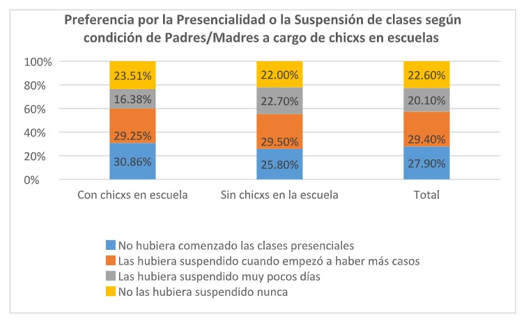 Esto permite inferir que el posible efecto “desorganización familiar” ocasionado por el cierre de las escuelas y el “no tener a quien dejarle lxs chicxs” no operó como se suele creer: si hubiese sido importante entre lxs padres y madres de chicxs escolarizadxs el nivel de preferencia por la presencialidad y contra la suspensión debería haber sido mayor y claramente es menor.