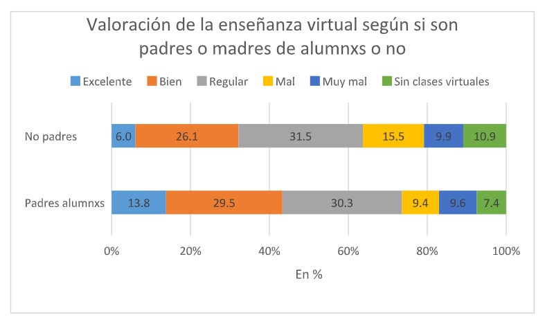 El recurso a las clases virtuales y la incorporación de las nuevas tecnologías de la comunicación para sostener la continuidad pedagógica en el contexto de suspensión de la presencialidad escolar es uno de los tópicos que tiene respuestas más positivas de parte de lxs encuestadxs, con el agregado de que hay una diferencia estadística significativa de 10 puntos de mayor valoración sobre la enseñanza virtual entre quienes tienen chicxs en la escuela sobre quienes no los tienen. A pesar de la emergencia y la improvisación evidente, la experiencia de la virtualidad en general ha sido rescatada como positiva por quienes la experimentaron y en cambio despierta más reservas entre quienes no la experimentaron.
