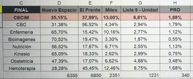 Medicina. El Frente (PO + La Mella) 37,8%, Nuevo Espacio 35,1%, Miles 13%, Lista 9 (La Cámpora, Nuevo Encuentro, La Fuser-Futura) 6,8%, PRO 1,8%.