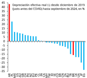 La segunda burbuja, a partir de agosto, contó con el financiamiento del exitoso blanqueo por el que ingresaron 23.300 millones de dólares (que sin embargo no recompusieron las siempre enrojecidas reservas), y produjo rendimientos del 30,1% en dólares, entre agosto y noviembre. En pocos días se sabrá si las golondrinas financieras no han emprendido ya el regreso hacia el clima más cálido de Wall Street, cumpliendo la profecía del ex jefe del Instituto Internacional de Finanzas (IFF), Robin Brooks, de otra gran devaluación. Según Brooks, desde la pandemia el peso no ha dejado de apreciarse, mientras el real brasileño pasó a ser de los más débiles, cosa que considera insostenible. La evolución de ambas monedas, en rojo en el gráfico.