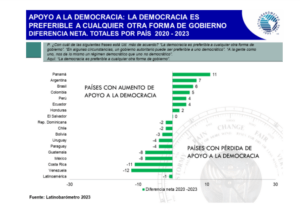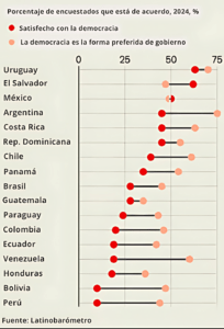 El informe de este año confirma la masiva preferencia por la democracia en la Argentina, superior al 76%, por encima a la de cualquier otro país de la región. Pero entre esas mismas personas encuestadas, no llega a la mitad quienes se declaran satisfechos con la democracia que tienen. Aun así, la Argentina está cuarta en ese ranking, sólo superada por Uruguay, El Salvador y México.