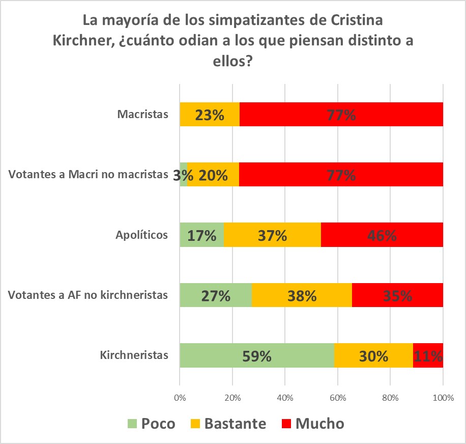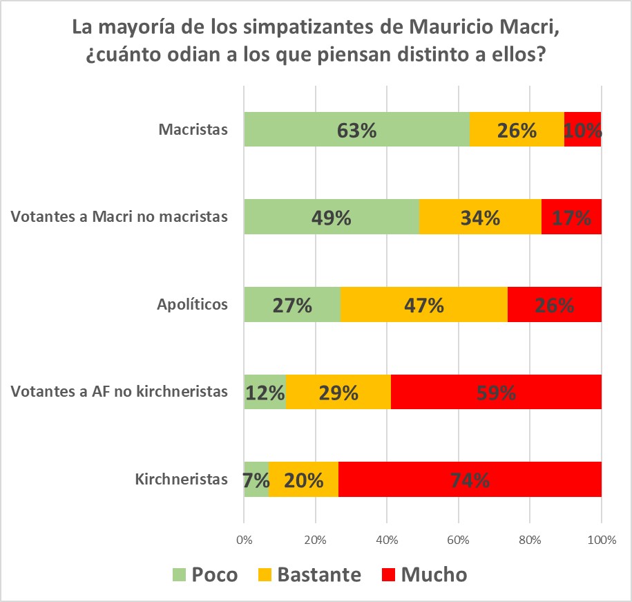 Se presentaron dos preguntas “en espejo”: “La mayoría de los simpatizantes de Cristina Kirchner, ¿cuánto odian a los que piensan distinto a ellos?”, y luego: “La mayoría de los simpatizantes de Mauricio Macri, ¿cuánto odian a los que piensan distinto a ellos?”, brindándoseles tres posibilidades de respuesta: poco, bastante o mucho. Es decir, no preguntamos cuánto odian los encuestados/as (muchos podrían haberlo negado) sino que procuramos captar cuánto imaginan que el otro los odia a ellos/as.