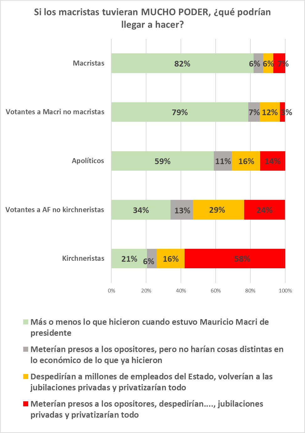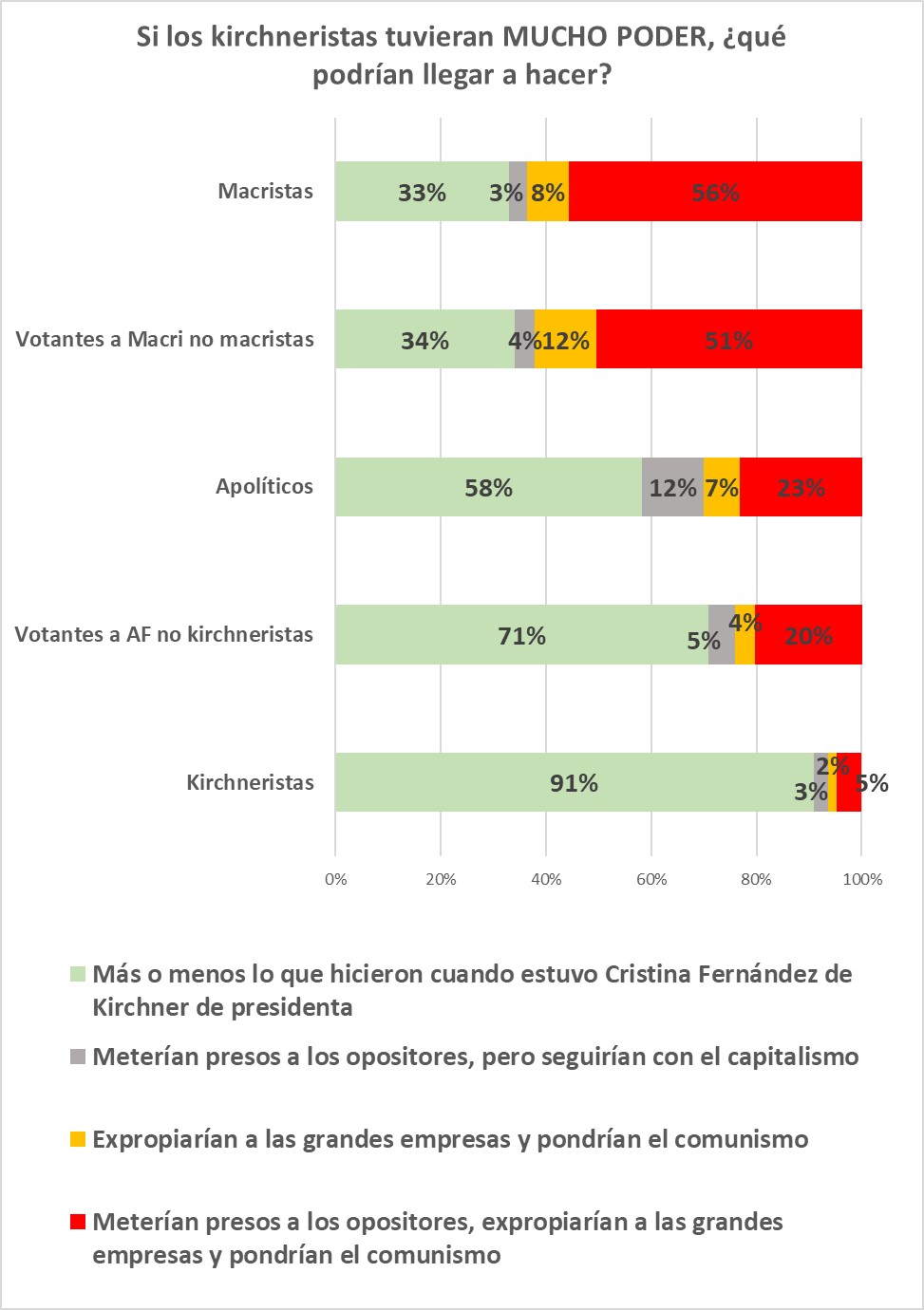 Para ver los fantasmas que atormentan a uno y otro lado de la “grieta” preguntamos qué sucedería si el otro pudiera hacer lo que quisiera. Primero preguntamos “si los kirchneristas tuvieran MUCHO PODER, ¿qué podrían llegar a hacer?” (Escrito con estas mayúsculas enfatizadoras, para que se leyera en los dispositivos de quienes respondían la encuesta.) Y luego hicimos la misma pregunta, pero sobre lo que podrían llegar a concretar los macristas. Las opciones de respuesta comenzaban con “más o menos lo que hicieron cuando estuvo Cristina Fernández de Kirchner de Presidenta” (o Mauricio Macri, en la otra pregunta), y luego se proponían otros tres escenarios posibles: persecución política de los opositores, drásticos cambios económicos (especificados según los posibles temores) o la concreción de ambas medidas.