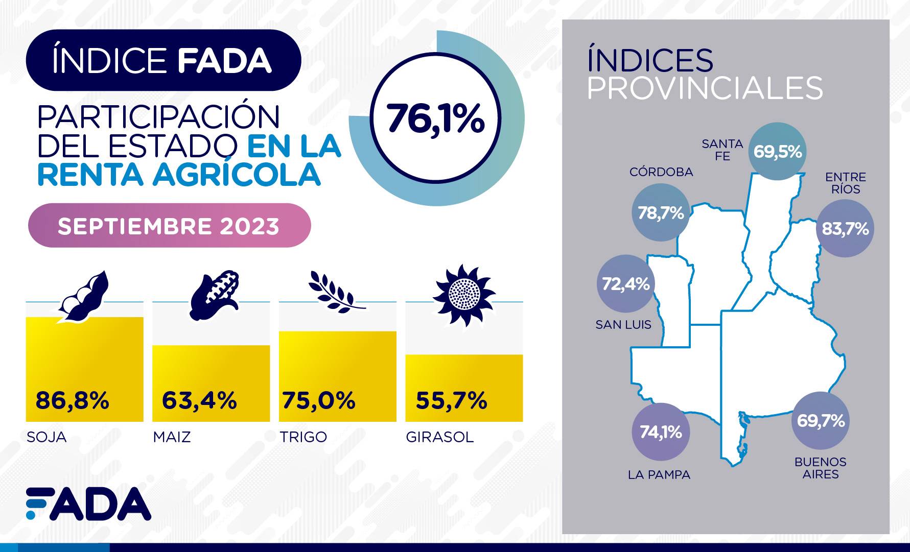 Lo dice FADA de otro modo: “En cuanto a la suba de DEX anunciada y enviada recientemente al Congreso, hicimos un ejercicio para estimar el impacto y descubrimos que el Índice FADA no tendría una suba sustancial, pasaría de 59% a 60,4%, ya que el grano que mayor impacto tiene es soja y queda sin modificaciones. En el caso de maíz y trigo subiría 3 puntos porcentuales y 13 el girasol”, explicó Natalia Ariño, economista de FADA.