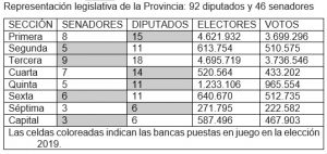 La provincia, para la integración de la Legislatura, tanto para la Cámara de Senadores como la de Diputados, en lugar de hacer una elección general por distrito único se divide en secciones electorales. Y sin ninguna justificación plausible, al menos para el siglo XXI, la ley atribuye arbitrariamente una cantidad de legisladores a cada sección.