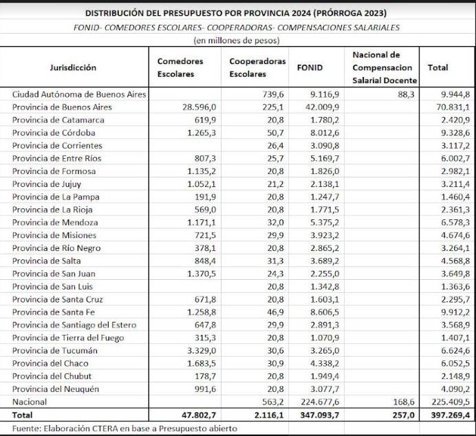 Si ha sido la lucha colectiva de las y los trabajadores de la educación la que obtuvo como resultado leyes que el gobierno de Milei intenta desconocer, es imposible que esas conquistas no sean defendidas por CTERA. Por eso exige al gobierno nacional que envíe los recursos económicos para el FONID, el Fondo Compensador y los comedores escolares a todas las provincias.