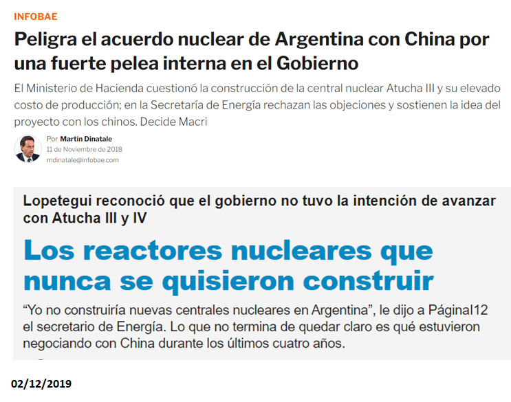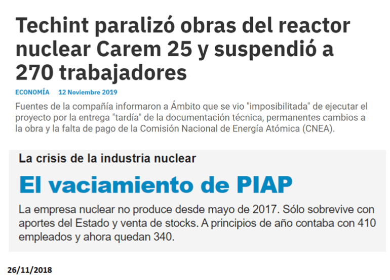 • Entre 2016 y 2019 se volvió a desarticular y desfinanciar el sector nuclear, pero sin dejar de vociferar anuncios que nunca se cumplieron. Se anunció que la quinta central –la segunda que se compraría a China– se iba a emplazar en Sierra Grande (Río Negro), pero el proceso terminó con una ley antinuclear en Río Negro. Se habló de renegociar el acuerdo con China, se decidió que se compraría solo una central –se abandona la compra de la central CANDU–, pero todo quedó inconcluso. En contexto de desaparición de más de 20.000 PyMEs, fue dramática la sangría de personal en la Planta Industrial de Agua Pesada (Neuquén), CNEA y Nucleoeléctrica. Además, se paralizaron las obras de la nueva planta de Dioxitek en Formosa, se inició el proceso de cierre de las instalaciones en Pilcaniyeu, se perjudicó a CNEA en su participación accionaria en varias empresas y se generaron deudas que hoy CNEA trabaja para saldar.