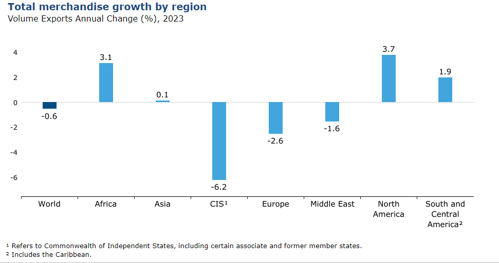 Los volúmenes de importaciones y exportaciones variaron en función de las regiones. Según se detalló, “si bien la demanda de importaciones en términos de volumen cayó en Europa (-4,7%) y América del Norte (-2%), se mantuvo esencialmente estable en Asia (-0,6%) y aumentó en regiones exportadoras de combustible, como Oriente Medio (9,8%)”. Por otro lado, el volumen aumentó en América del Norte (3,7%), África (3,1%) y América del Sur, Central y el Caribe (1,9%).