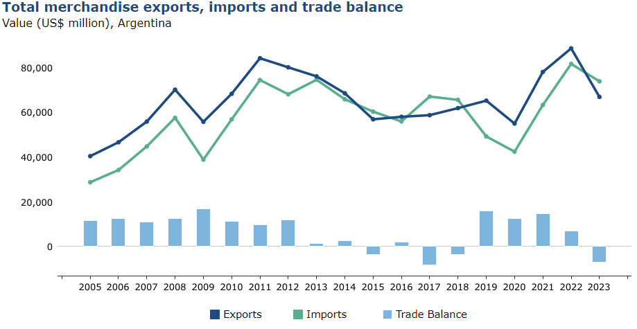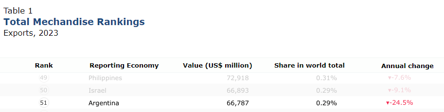 En el caso de este informe en particular, para el año 2023 la Argentina se ubicó en el puesto 51 en función de su exportación de mercancías, lo que supuso una caída anual del 24,5% y una participación en la torta global del 0,29%. La sequía que afectó a las exportaciones del agro en ese ejercicio fue responsables de la caída de varios escalones.