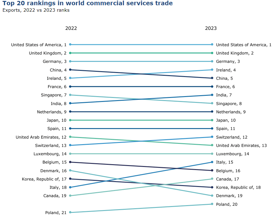 “El comercio de servicios siguió muy concentrado en 2023. Las mismas diez principales economías fueron las principales exportadoras e importadoras de servicios comerciales, aunque en diferente orden. Los Estados Unidos (12,7%), el Reino Unido (7,4%) y Alemania (5,5%) representaron más de una cuarta parte de las exportaciones de servicios”, detalló el trabajo.