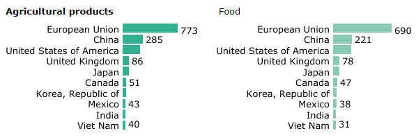 Mirando en cambio las importaciones, el ranking se conformó en el siguiente orden: Unión Europea, China, Estados Unidos, Reino Unido, Japón, Canadá, Corea, México, India y Vietnam.