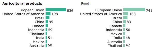 Ahora bien, si se desglosa el informe de la OMC por las exportaciones agrícolas en particular, la Argentina tampoco logró entrar en el top 10 de participación exportadora, que se conformó en orden de importancia por la Unión Europea, Estados Unidos, Brasil, China, Canadá, Indonesia, Tailandia, India, México y Australia.