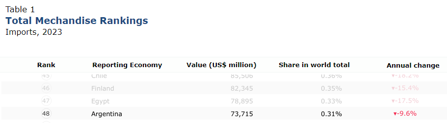 En términos de las importaciones globales, la Argentina se ubicó para ese año en el puesto 48, lo que supuso una caída del 9,6% y una participación en la torta del 0,31%.