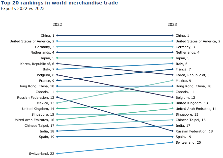 Respecto del ranking de participación de las principales economías en las exportaciones mundiales de mercancías, de los 20 países analizados –entre los que no figura la Argentina–, los primeros 10 representaron el 49,9% de las exportaciones mundiales de mercancías en 2023, frente al 49% en 2022.