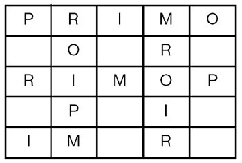 Fíjese en el siguiente cuadrado de 5 x 5. Contiene 25 casillas. La mayoría están vacías con ocho excepciones: todas las de la primera fila y tres de la tercera. Si se fija con un poco más de cuidado, en la primera fila aparecen cinco letras distintas: P, R, I, M y O. Y en la tercera, aparecen solamente tres de ellas: I, M y O.