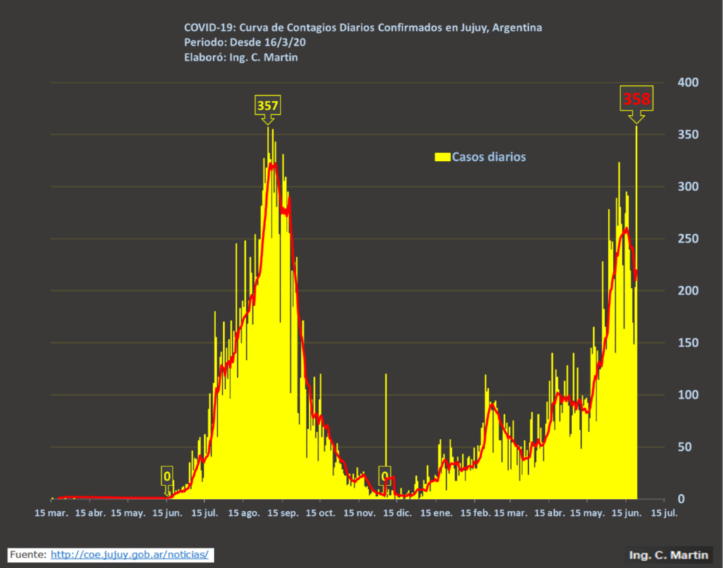 El pasado miércoles 23 de junio, la provincia de Jujuy registró la mayor cantidad de contagios en un día desde el inicio de la pandemia. Fueron 358 casos, más del doble que los que contabilizó un mes atrás. Sin embargo, el gobernador Gerardo Morales no dio el brazo a torcer y continuó con la convocatoria a elecciones legislativas locales prevista para el día de hoy, cuando 570.879 personas están en condiciones de asistir a las urnas. Un informe del Observatorio Covid-19 de la Universidad Nacional de Jujuy (UNJU), a cargo del ingeniero Carlos Marín, advirtió que frente al incremento de la incidencia de casos, el gobierno debería tomar medidas excepcionales. Claramente, frenar la convocatoria a las elecciones no fue una de ellas.