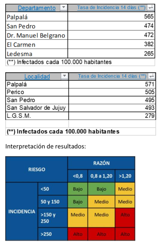 Por otro lado, cinco de los departamentos con mayor población de la provincia registran en los últimos 14 días incidencias acumuladas muy superiores a los 250 casos por 100.000 habitantes, lo que implica un riesgo epidemiológico y sanitario alto. Se trata de los departamentos de Manuel Belgrano –que incluye a San Salvador de Jujuy–, El Carmen, Ledesma, Palpalá y San Pedro. Esta situación “coloca en máxima tensión al sistema de salud y genera o puede generar grave riesgo de saturación y consiguiente aumento de la mortalidad”, especifica el informe.