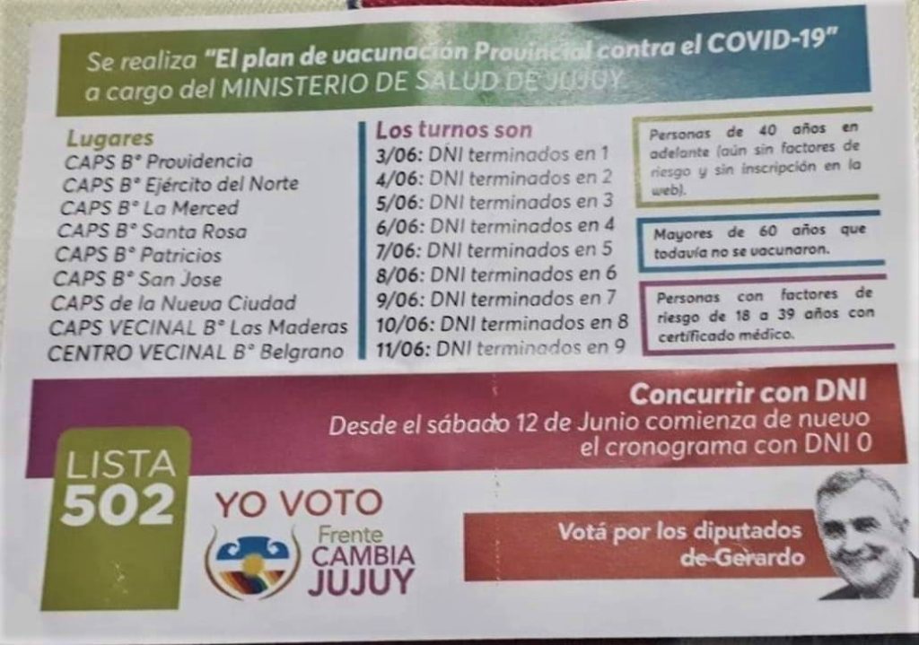Lo que no se puede desconocer es que el gobernador jujeño sí se preocupó por difundir el dispositivo de vacunación. Para ello distribuyó panfletos con el logo de Cambia Jujuy y una leyenda que rezaba “votá a los diputados de Gerardo”. No había espacio en el volante para aclarar que las vacunas las envió el gobierno nacional.