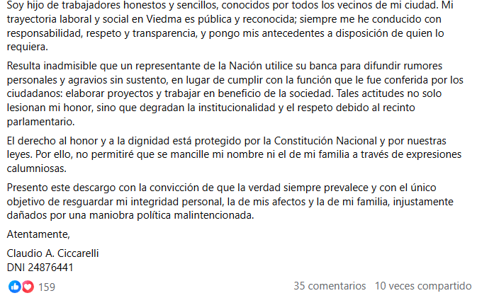 Ciccarelli estuvo en el auditorio donde Espert agradeció el vuelo en el avión de Machado durante la campaña de 2019. Suya era la Jeep Grand Cherokee (que le había cedido con la cédula azul) atacada ese año con supuestos “piedrazos”. Esto fue puesto en duda por la diputada Lilia Lemoine (alter ego de Javier Milei en el Congreso), quien en una entrevista televisiva con Angel Etchecopar especuló que se trató de balazos.