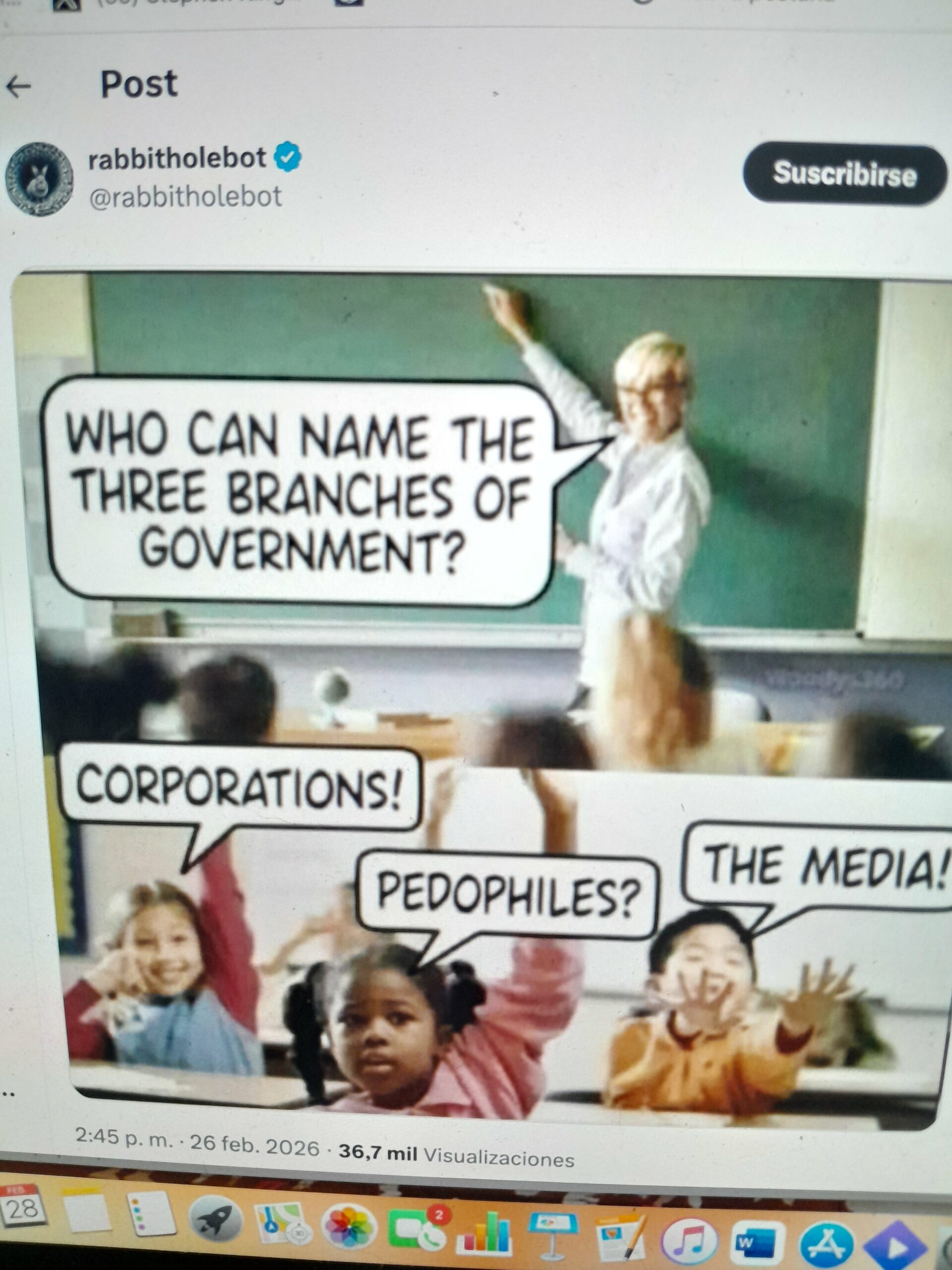 Y mientras tanto, el pueblo argentino no sale de su marasmo. Con la cabeza envenenada por los medios que responden al poder. Demonizando a la líder a quien tuvieron que meter presa, para hacer posible este desbarajuste. Con una imagen de sí mismo distorsionada por completo, al punto de que —como decía John Steinbeck— no se considera "como un proletariado explotado, sino como millonarios en dificultades momentáneas". Entregando a sus jóvenes y niños a las redes y pantallas, que entretienen al mismo tiempo que los alejan de la conciencia de la realidad profunda y de toda posibilidad de explicarse —y por ende cambiar— lo que pasa. (Hay un meme que muestra a una maestra preguntando en clase: "¿Quién puede nombrar las tres ramas del gobierno?" Una niña se apresura a responder: "¡Las corporaciones!" Otra agrega, insegura: "¿Los pedófilos?" Y el tercero remata: "¡Los medios!" Triste, pero real.)