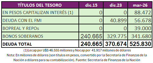 El ministro Luis Caputo recorre el sistema financiero mundial una y otra vez con el fin de obtener préstamos y o refinanciaciones de deuda. En abril de 2026 logró la ampliación del crédito del FMI en 1.000 millones de dólares, y debe pagar en julio de 2026 la suma de 4.507 millones, de los cuales el 95% son bonos soberanos (Bonares y Globales), y el 5% restante es deuda con organismos internacionales de crédito.